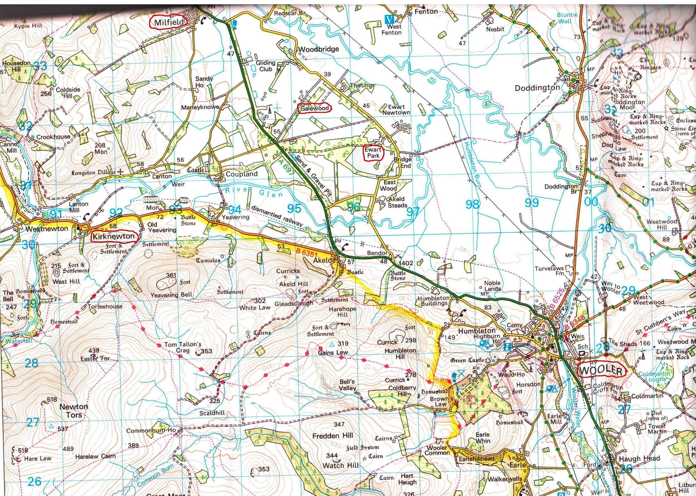 Josephine Butler locations circled in red. Clockwise, Milfield is at the top, then Galewood and Ewart Park are lower and more central, Wooler is on the right towards the bottom and Kirknewton is on the left of the map. (Ordnance Survey Landranger sheet 75)